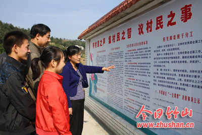 今日竹山网消息 10月26日,城关镇委组织委员陈云(右一)正带领该镇12个村(场)后备干部参观全县新农村建设示范村——桥儿沟村基层党建“五个基本”建设情况。今年以来,该镇把“五个基本”即基本组织、基本队伍、基本活动、基本制度、基本保障建设融入新农村建设,通过建立宣传专栏,党员文化活动中心,图书室等形式,开展多种群众喜闻乐见的活动,使“五个基本”建设在全镇全面展开。(陈昌荣 冯家斌)