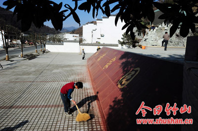 今日竹山网消息 12月22日,记者在潘口乡潘口河村新建的社区文化广场看到,村民周才华在广场前清扫垃圾,以保持社区的整洁卫生。
