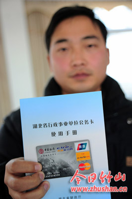 今日竹山网消息 12月21日,县财政国库支付中心工作人员正在展示公务卡及使用手册。截至目前我县已办卡单位96个,办卡6358张,办卡面达到了82%。