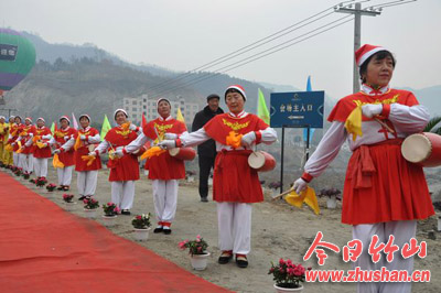 今日竹山网消息 气球高飘,彩旗飞扬。12月23日,国际绿松石城开工庆典现场一派喜气洋洋。场上一群身着鲜艳服装的中老年人腰鼓队更是格外吸引了观众的眼球。