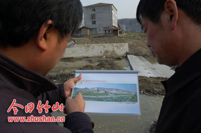 县水务局局长朱波(右)和溢水镇党委书记周乾隆现场会商溢水河道整治美化