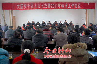 今日竹山网消息 “今年,全乡实现农村经济总收入9000万元,农民人均纯收入达到3500元……”3月1日,大庙乡党委书记、乡长陈松在乡人大七次暨经济工作会上提出奋斗目标时赢得代表、委员和乡村干部的热烈掌声。