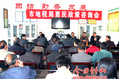 今日竹山网消息 3月29日下午,一场由市地税局“三万”活动工作队组织的“惠农利民政策咨询会”在上庸镇北坝居委会举行,30多个闻讯赶来的村民把不大的会议室挤得满满当当。