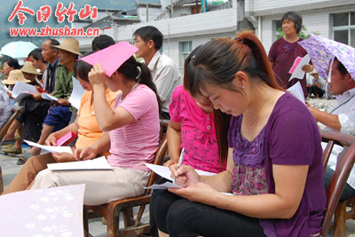 今日竹山网消息 6月16日,官渡镇街道居委会木棕片区十星级文明农户评选大会召开,各户代表不仅为自己该得几颗“星”打了“勾”,还为居住在片区的邻居投上了神圣的一票,这是官渡镇为实现移民安置区的和谐发展实施的“十星级”系列文明创建活动之一。