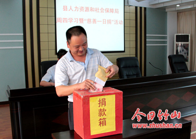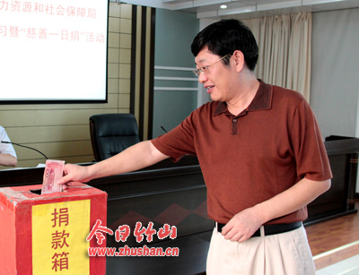今日竹山网消息 8月4日,县人力资源和社会保障局开展了“慈善一日捐”活动,局长方显春带头捐献100元现金,局机关、二级单位干部职工也慷慨解囊,纷纷献出爱心。在不到10分钟的时间里,该局干部职工向县慈善基金会捐献4000元,以做好扶贫济困工作。(袁平凡 喻淑超)