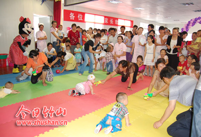 “7个月至1岁的幼儿及家长请上台,爬行活动现在开始!”随着主持人的一声令下,生龙活虎的小家伙们,在“加油”吆喝声中不知所措,他们或停,或坐,或爬到小朋友中抢玩具,急得家长们有的在前面用玩具引导,有的家长干脆在后面推,博得现场笑声阵阵。