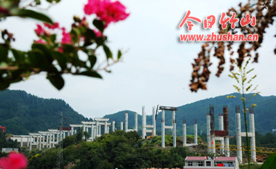 今日竹山网消息 中秋佳节,谷竹高速公路竹山段建设者们放弃与家人团聚的机会,始终坚守在建设工地一线,他们心中装着一个信念:希望工程早日竣工,早日通车。图为壮观的城关霍河高架桥蜿蜒在山间。(袁平凡)
