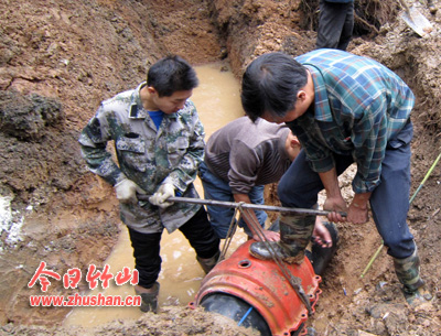 今日竹山网消息 27日上午8时,北大街某处因施工造成十堰路至北大街DN400供水主管道断裂,北大街沿线近万余户居民和百家企事业单位、商户正常用水受到严重影响。自来水公司总经理徐茂群接到险情报告后,迅速启动管道事故紧急供水预案,调度相关人员,强行关闭该管道主控闸阀,启动备用管道供水;迅速组织抢修专班火速赶到现场进行抢修(如图),确保在中午12时恢复了城区居民生活正常供水。