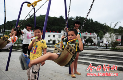 今日竹山网消息 9月27日,溢水镇下腰店居民正在其社区广场荡秋千。下腰店新型社区内需安置潘口电站移民、谷竹高速移民80户,350人,为妥善安置移民,下腰店按照“1+9”模式建设新型社区,农村党员群众电教中心、综治维稳便民服务室、图书阅览室、村级卫生室、计生服务室、农村劳动力就业培训中心、农民专业合作社、村级综合服务社和文体广场一应俱全,使移民过上了城里人的生活。(全正 黄治保)