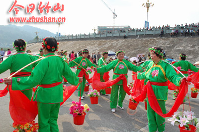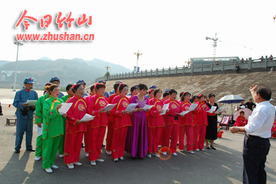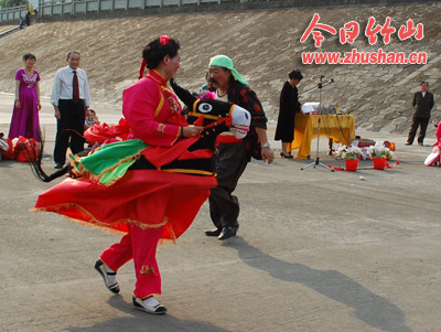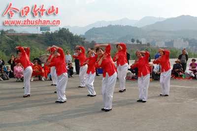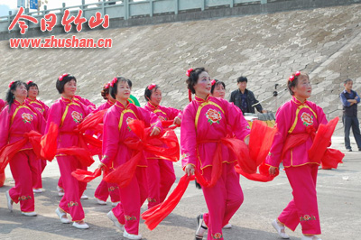 今日竹山网消息 9月30日,城关镇将军潭广场人山人海,歌舞升平,近千名群众齐聚于此,共同观看由城关镇民间艺术团带来的歌舞表演。据该团团长冯中福介绍,此次活动是他们自发组织团员进行表演的,旨在以歌舞的形式的表示表达迎接建国62周年的幸福之情、自豪之感,活动得到了县文体、住建等部门的大力支持。活动中,该团共表演了秧歌、划彩船、独唱等13个文艺节目。(张成)