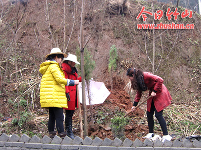 今日竹山网消息 3月8日,为纪念“三八”妇女节和3.12植树节,溢水镇组织机关单位、镇直单位干部100余人冒雨开展义务植树活动。溢水镇党委书记、人大主席周乾隆带头参加活动。大家携带铁锹、镐头等工具在朱家湾村牌楼垭分工合作,有的翻土锄草、有的清理石头、有的种植苗木、有的修剪树枝、有的培土浇水,大家忙得一身汗、一脚泥。经过两个小时的努力,共种植了400余株侧柏为305省道两旁添了新绿。 (方琨)