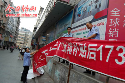 8月初以来,县城建执法大队集中人力物力,加大巡查力度,扩大管理范围,划分责任片区并落实到责任人。共取缔出店占道经营100余户,划定城区人行道停车泊为20余处,拆除破旧广告招牌40余块,规范设置店头小招牌10户,清理商业性条幅70余条,查处违法乱搭乱建10处,查处乱倒建筑垃圾3处、损坏公共设施2处,规范夜市摊点3处40余户,对3处菜市场进行划线规范管理,给县城广大居民创造一个卫生、整洁、健康舒适的工作和生活环境。(党世根 冯成 陈诚 文/图 )