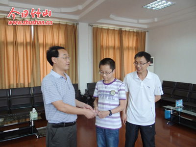 今日竹山网消息 6月14日,竹根联盟“看看”等爱心人士将800元现金送到茂华中学校长方孝文手中,请他转交给该校八年级学生沈子航。这笔善款来自江西宜春奉新县,捐赠人喻民先生是奉新鑫工异型砂轮厂厂长。这已是喻民先生第二次为沈子航提供资助了。