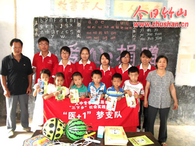 对于每天的课程安排,“医+1”梦支队队员们都做了详细了计划和明确的分工。在课堂上,队员们给孩子讲授课本外的知识,如英语字母的教学。也特别针对于小学生的安全问题,利用自己带的笔记本电脑采用多媒体与小品表演相结合的形式,告诉孩子们如何远离火灾、如何防溺水等;课外,陪孩子们玩耍,打皮球,踢毽子,叠星星,带孩子们体验田地生活等。看见孩子们脸上天真无邪的笑容,每位队员都觉得很幸福。在支教结束的那天,队员们和孩子们坐在一起,畅谈各自未来的梦想,当主持人说,“孩子们,你们未来的梦想是什么?”,“医生”、“宇航员”、“警察”、“老师”等等,听着孩子们的梦想,队员们也表达了自己的希望。队员代表周秀这样告诉孩子们,“孩子们,只有敢于有梦想的人,未来才有可能成功!”,看见孩子们异口同声的答应声,队员们很是欣慰,因为他们看见了未来这个社会的希望。支教活动结束后,天空中的雨越下越大,老师和孩子们舍不得离开他们,一名7岁小女孩,抱着女队员的腿,“姐姐,别走”,“我不走,来我背你回家”女队员弯下腰,背起了小女孩,旁边有另外一名队员撑着雨伞,一行三人朝小女孩家里走。接下来的两天,教学点的学生放了暑假,队员们走访了孩子的家,与孩子家长倾心交谈,了解家长对孩子的教育情况及家长们对乡村教育的意见和建议。并向周围居民宣传了高血压的预防措施及养生保健小知识。