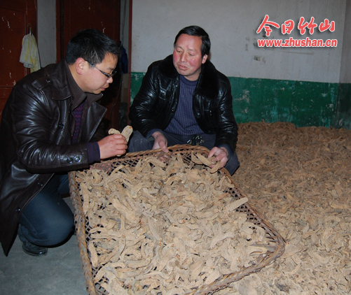 今日竹山网消息 来到双台乡界岭村曹林家,地上堆满了干天麻,“这些值多少钱呀?”曹林说:“有2吨货,要值40多万元,过几天就有安徽客商来拉货。”