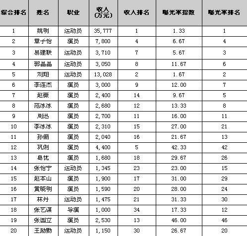 3月17日,《福布斯》中文版发布了“2009中国名人榜”。这是《福布斯》中文版连续第6年推出该榜单。小巨人姚明稳居榜首。刘翔的综合排名从去年的第2名滑落到今年的第5名。章子怡凭借《梅兰芳》等作品和多个重量代言跃居榜单第2位。易建联位居第三。