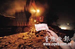 昨日(4月13日)傍晚,重庆市沙坪坝区双碑光荣坡一拆迁工地上,挖掘机挖出一堆钱。正在现场的拾荒者和附近群众,一拥而上争抢这些钱财。当晚,该房原主人蔡先生获知消息后赶到现场,只捡到几片被撕碎的人民币碎片。蔡表示,自己遗忘在房内的钱至少有四五万元。