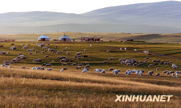 羊群在京津周边沙源治理工程项目区——内蒙古克什克腾旗贡格尔草原上觅食(2007年6月摄)。自2000年国家启动京津风沙源治理工程以来,内蒙古自治区累计投入生态建设资金170多亿元,生态治理总面积超过2.7亿亩。全区十多万林业职工、造林队员和志愿者扎根大漠,造林治沙,用辛勤汗水浇灌北疆“绿色长城”。同时,林业生态管理部门着力实施退耕还林、退牧还草、季节性休牧等措施,草原生态环境得到明显改善。截至2009年初,内蒙古自治区森林总面积居全国第一位,森林覆盖率达到17.5%,成为祖国北疆最重要的生态屏障。新华社记者 张领 摄