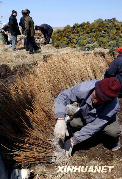 造林队员在京津周边沙源治理工程项目区——内蒙古克什克腾旗生态建设项目区内栽植松树苗(2009年5月摄)。 |