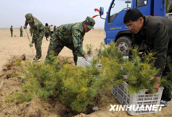 造林队员在京津周边沙源治理工程项目区——内蒙古克什克腾旗生态建设项目区内栽植松树苗(2009年5月摄)。