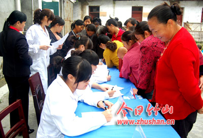今日竹山网消息 10月21日,一清早城关镇明清村400多名适妇女陆续乘客车来到城关镇卫生院,负责开展妇女病普查普治的医务人员急忙把她们安排到院内进行登记,及时逐一进行检查和治疗。
