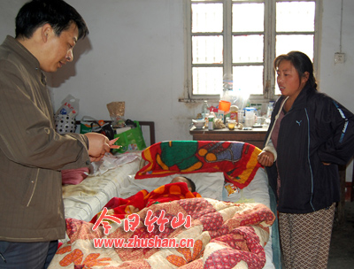 今日竹山网消息 10月22日,竹山论坛管理员“踏遍青山”(左)把“会飞的灰太狼”寄来的500元捐款交给烫伤小女孩的父母。此前,网友“大山游子”的1000元捐款也已打入受捐家庭帐户。由于无钱住院,重度烫伤的小女孩只能在城关镇莲花村卫生所进行最基本的治疗。医生建议说,伤势太重,应该转到条件较好的医院进行综合治疗,在这里实在太危险了……(袁帅 陈剑)