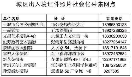 秦楚网讯(十堰晚报)记者 任小帆 通讯员 叶静 报道:昨日,记者从市公安局获悉,5月1日起,十堰市出入境证件照将统一采集。