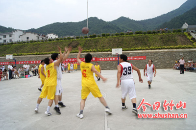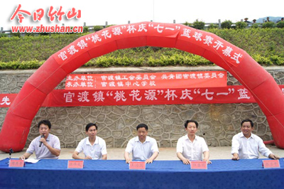 今日竹山网消息 6月18日,官渡镇组织全体机关干部开展“桃花源”杯篮球赛,庆祝建党91周年,县领导王治国应邀出席开幕式。