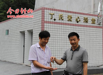 今日竹山网消息 7月4日,楼台乡爱心人士丁直维将验收合格的澡堂钥匙交到楼台学校校长高博手中。高博感激地说:“有了太阳能澡堂,学生和老师们夏天洗澡的难题就解决了,孩子们的卫生状况将得到较大改善。”