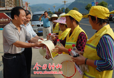 县领导简育田、王宝贵为环卫工人送上“清凉包”