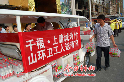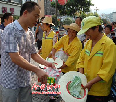 湖北福星达房地产开发公司竹山分公司经理谢邦平为环卫工送“清凉包”