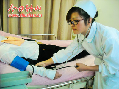 周丽在为病人测量血压。