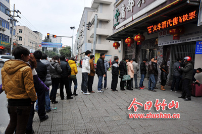 今日竹山网消息 2月18日上午,返城人员在县城庸都宾馆火车票代售点处排成长长的队形,等候购买火车票。工作人员告诉记者,他们从除夕到现在一直没有休息,每天早八点开始上班,到晚八点结束,为出行者代购火车票近万人次。(袁平凡)