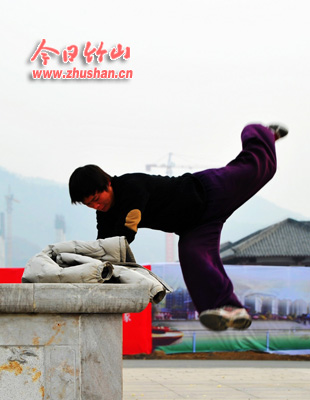 记者和几位影友上前攀谈,这名个头不高,留着长发的小伙子始终没有说出自己的姓名。他只说,他在十堰练习跑酷已有半年了,春节回家过年,有事无事都要找地方酷跑一会子。对竹山这样小城镇来说,跑酷还是少见,它锻炼身体,娱乐自己,养眼他人,三全其美。(袁平凡)