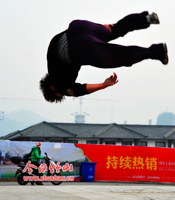 今日竹山网消息 2月12日,正月初三,国际绿松石城广场。一名不愿说出自己姓名的小伙子,一会儿飞奔,一会儿空中翻,一会儿倒竖,一会儿飞跃到台阶上,可谓飞檐走壁,好不轻松自在,赢得围观者一边赞叹一边拍照。