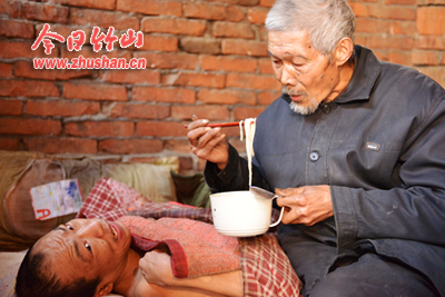 今日竹山网消息 3月3日,城关镇城西村1组村民范启胜在给养子喂饭。36年前,范启胜夫妇抱养这个孩子以“押子”,不料如今仍要顿顿喂饭。而且,由于养子瘫痪,日常生活起居都得两位老人料理。