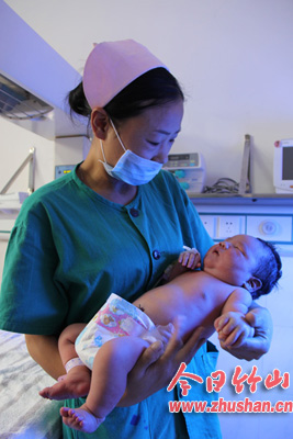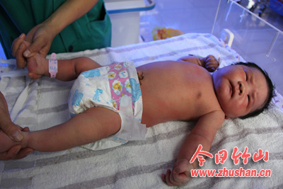 今日竹山网消息 7月9日,县妇幼保健接生了一个巨大胎儿,体重10.6斤, 粗粗的胳膊,胖嘟嘟的脸蛋,似3至5个月大的个头,是少见的“胖娃”。