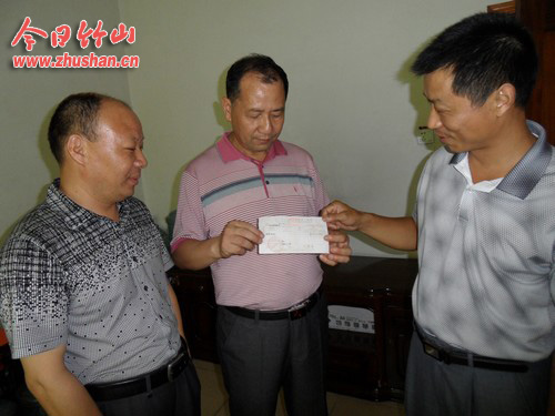 今日竹山网消息 8月6日,竹山县金龙节能有限公司办公室主任魏正志(中)将8000元“金秋助学”善款票据交给宝丰镇工会主席唐太平(右),用于帮扶宝丰镇双河口村的3名特困学生,解决了他们的燃眉之急。(王义富 唐太平)