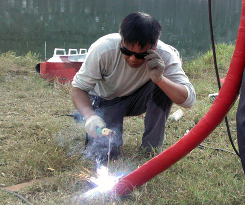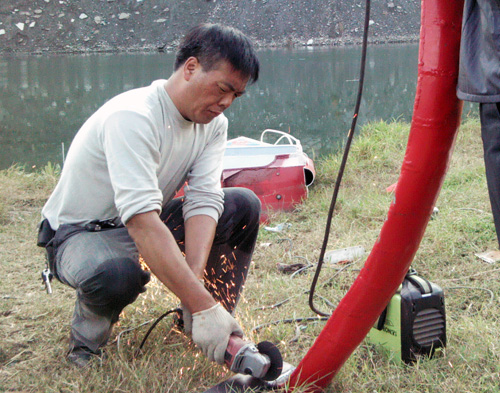 可是河水无情,有很多时候险情发生时,因没有专业的救生设备,不能及时赶到救生现场,很难避免悲剧的发生,对那些因溺水而失去生命的人,范根林深感婉惜,于是成立一个义务救助队的想法便在范根林的心底萌生。经过酝酿,今年四月份,范根林和兄弟范根成商议成立义务救助队一事,得到了范根成的大力支持,并立即付诸行动,购置了部分救生工具,联系了几位志同道合的熟悉堵河水情的朋友。但溺水事故一般发生较为突然,短时间内还是很难抵达救生现场,他们又想,要有一艘快艇多好啊,这样就能及时感到事发现场,为营救赢得更多的时间。兄弟俩经过商量,决定利用自己的特长,购买快艇设备,自己动手制作辅助设备。计划一定,兄弟俩就开始行动,自四月份以来,范根林只要一到双休和下班时间,就和兄弟范根成一起当起了焊工,为快艇早日下水做准备,经过半年多的辛勤劳作,11月3日终于完工。