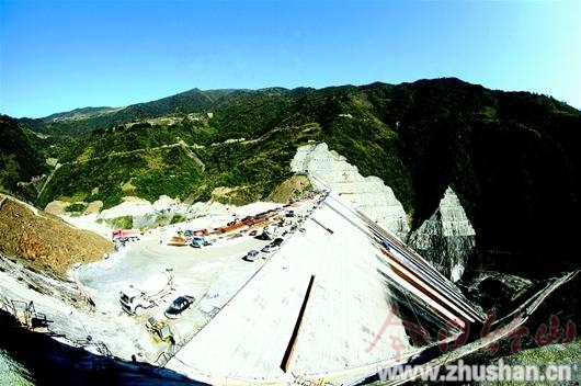 18日,竹山县龙背湾水电站大坝主堆石区填筑至495米高程,向月底下闸蓄水目标冲刺。该大坝为混凝土面板堆石坝,坝顶高程524.3米,水库最高蓄水位520米。龙背湾水电站位于竹山县堵河支流官渡河中上游,总投资22.8亿元,装机18万千瓦。 (章磊 摄)