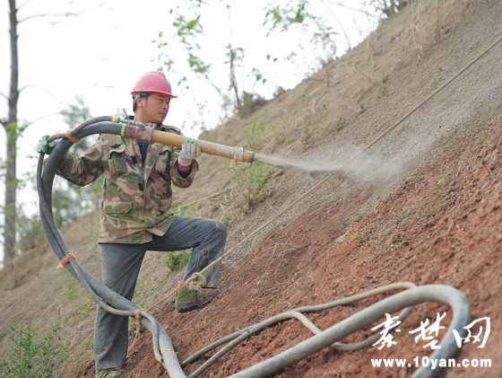 工人在进行挂网客土喷播施工