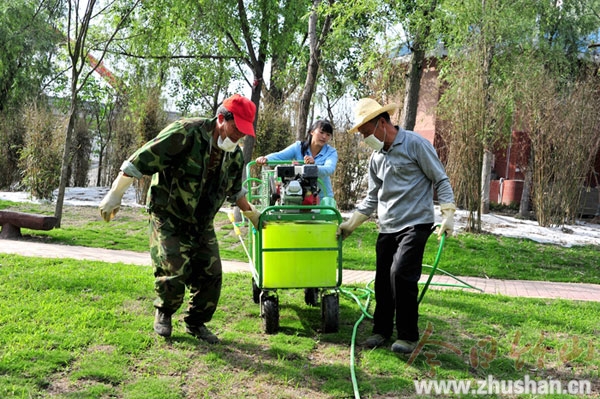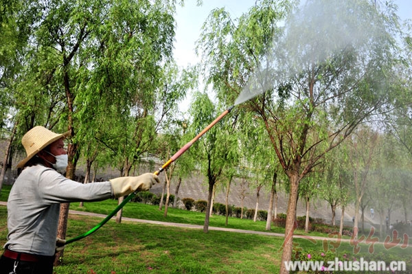5月2日,在堵河青年林小游园里,几名园林工人用高压水枪给柳树喷药灭虫。