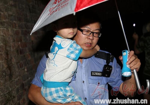 民警小邹和协警小郭一起把小孩抱到安全地带