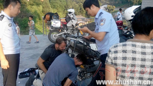 当日16时,溢水派出所民警在下乡处警过程中,听到群众议论:在溢水五房沟村出现了两名外国人。这引起了民警高度警觉,迅速赶到现场调查核实,经查实:意大利籍游客拉纳斯(男,英文名:Chris tof,现住上海市)、德国籍游客马赛厄斯(男,英文名:Mathas,现住上海市),两人均在上海工作,是好朋友,相邀从上海骑摩托车在中国部分省市自驾游,27日,两人从神龙架出发到陕西省安康市,骑车经过溢水镇五房沟村时摩托车车胎突然爆裂,人生地不熟又不会汉语,急得哇哇大叫,民警知情后迅速到镇上请来修理工,帮助二人免费修理摩托车,并与二人交谈,两位外国朋友被民警及在场群众的热情、友善所感动,连连竖起大拇指,并强烈要求与在场群众合影留念。 (李俊)
