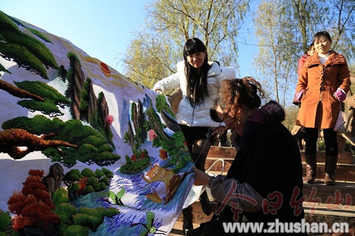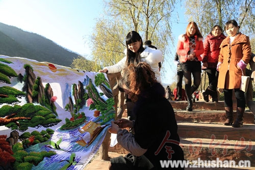 今日竹山网消息 12月18日,阳光明媚,堵河岸边一刺绣师傅绘制一幅美丽的迎客松,过往行人频频称赞美。(王志)