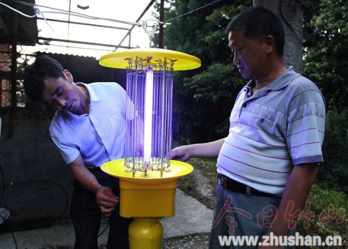 今日竹山网消息 7月18日,县林业技术员在九华山林场境内查看诱虫灯诱捕效果。近年来,县林业局加大推广诱虫灯诱虫技术,利用害虫较强的趋光、趋波、趋色、趋性信息的特性,按照每50亩的范围在果园、农业高产示范园、科技园、大棚、林间等处安装频振式诱虫灯,可大大减少农药的使用量,节约成本,对发展无公害农产品生产,确保农产品质量安全。(程平 李修军)