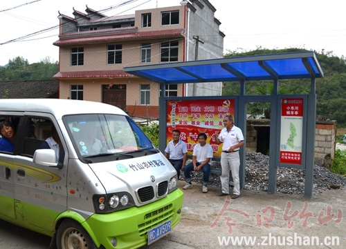 今日竹山网消息 8月21日,记者在溢水镇小东川村看到,几名村民正在候车亭等候“村村通”小客车,村民说有了候车亭下雨等车不怕雨淋了。