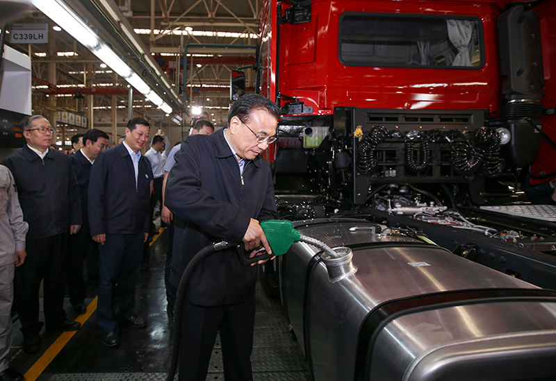 昨日,李克强总理来到十堰考察东风商用车重卡新工厂,在装配生产线旁应邀为新型重卡加油。(图片来源:中国政府网)