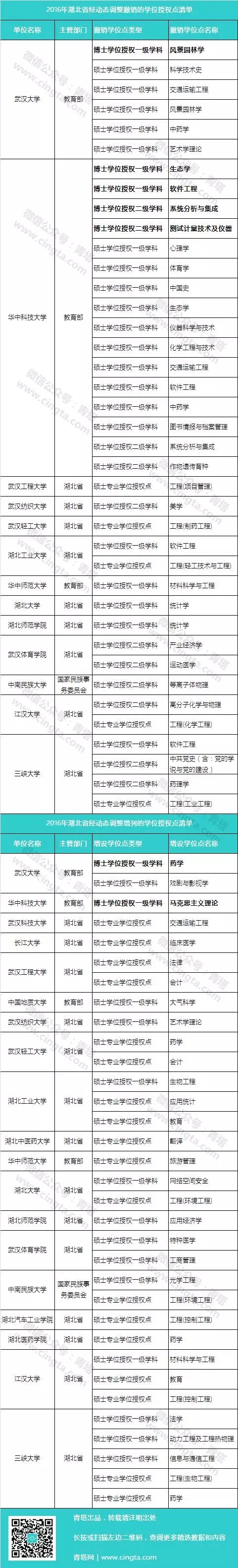 根据湖北省学位委员会公布的湖北2016年动态调整撤销和增列的学位点名单,武汉大学、华中科技大学、武汉工程大学等12所高校共撤销39个学位点,武汉大学、华中科技大学、武汉科技大学、三峡大学等19所高校共增列33个学位点。