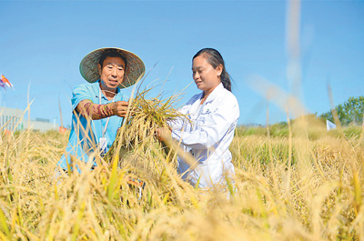 海水稻研发中心工作人员正在取样测算“海水稻”亩产。 |
